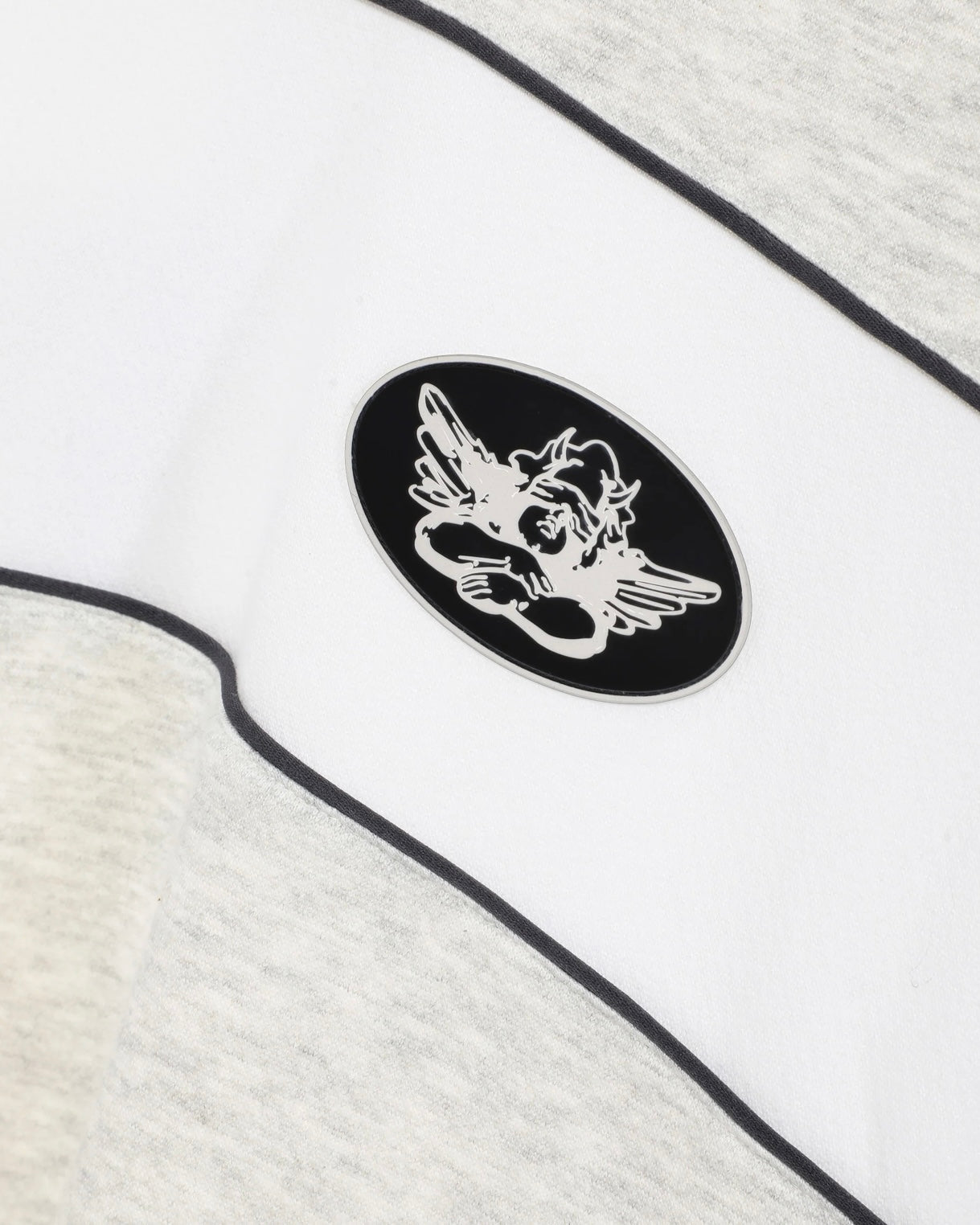 This color-blocked crewneck features contrasting grey, white, and charcoal panels with bold piping accents. A signature embroidered patch on the chest adds a sporty, elevated touch to the relaxed silhouette.
