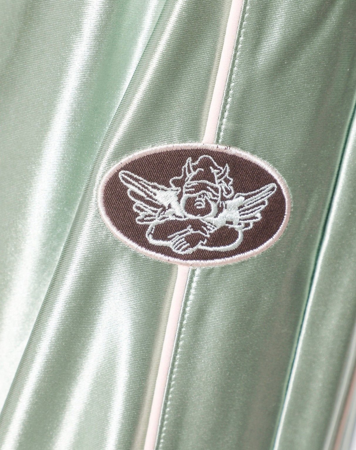 These mint green track pants feature a sleek, glossy finish reminiscent of satin but are crafted from lightweight, breathable material similar to basketball shorts. With a relaxed wide-leg fit, contrast piping, and a subtle embroidered logo, they strike the perfect balance between sporty comfort and streetwear polish.