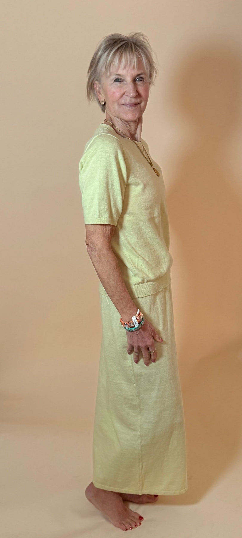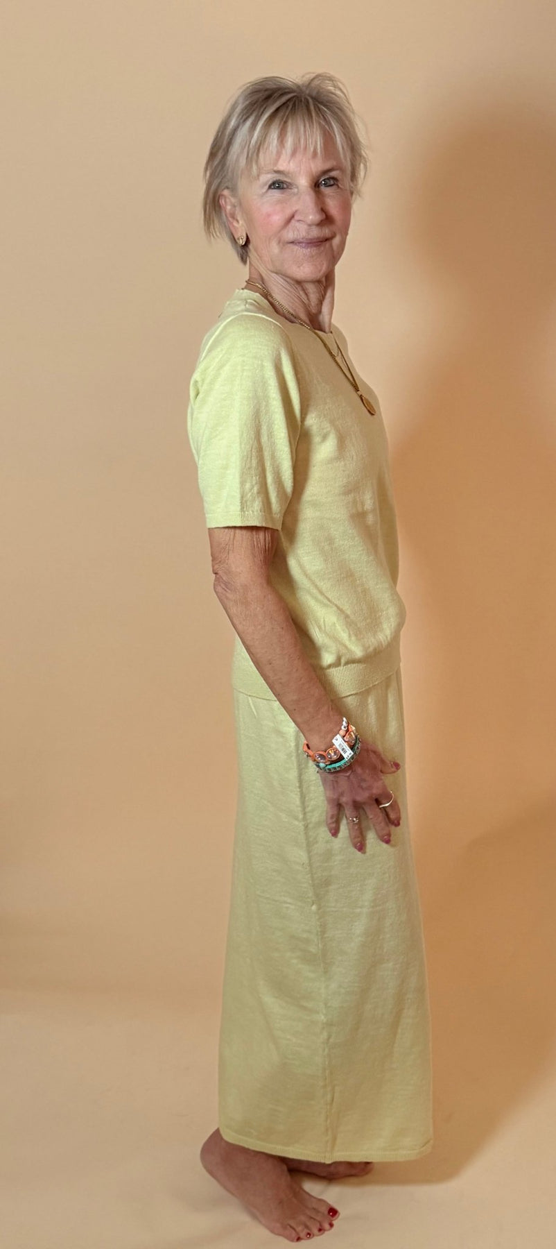 • Streamlined Maxi Skirt: A high-waisted, column-style maxi skirt with a wide, comfortable elastic waistband for a secure and flattering fit.